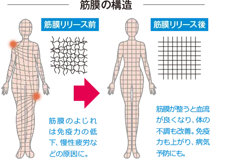 この筋膜が癒着(くっつく・固まり)したりねじれたりすると